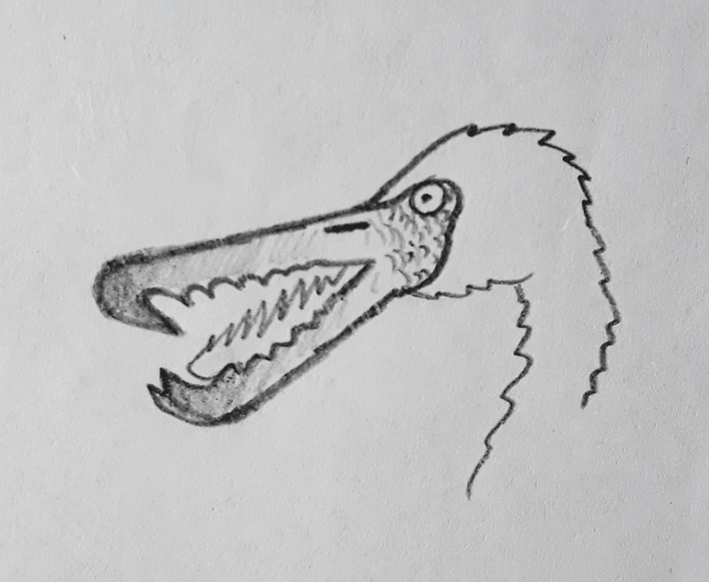 Клювы у этих птиц были совершенно невероятные: длинные, прямые (в отличие от изогнутых клювов фламинго!), верхняя половина имела на конце большой крюк, загибающийся внутрь под углом в плюс-минус 45 градусов, а по краю росла куча зубчиков, также направленных назад, уменьшающихся по направлению к голове. Нижняя половина была заметно короче верхней, имела менее выраженные зубчики и ДВА крюка на конце, но не загнутых назад, а торчащих вверх перпендикулярно клюву. Между ними была большая выемка, или, скорее, щель, в которую, по всей видимости, входил крюк верхней челюсти, когда рот птицы был закрыт. Язык и нёбо, насколько я разглядела, были покрыты целой щёткой маленьких, острых, загнутых назад шипов, и в целом рот птицы выглядел очень угрожающе. Клюв был гладкий, блестящий, грязно-жёлтого цвета, с чёрными кончиками, особенно ближе к крюкам, и ноздрями в виде узких щелей. Глаза жёлтые, с крошечными зрачками. От клюва до глаза - участок тёмно-серой (может быть даже зеленоватой!) кожи без перьев, покрытой чешуёй (?) и по текстуре даже похожей чем-то на кору дерева.